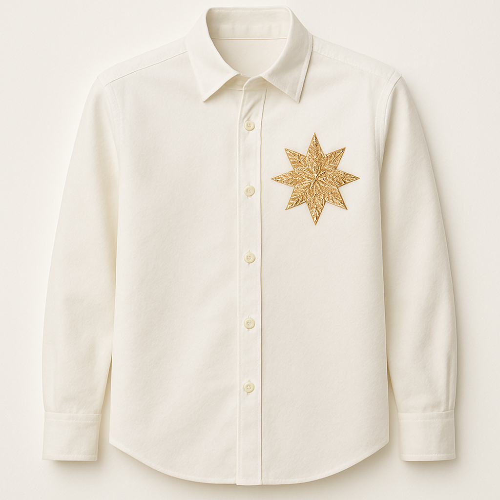 This exquisite white shirt features a sophisticated golden star-shaped embroidery on the chest, adding a touch of elegance and refinement to its classic design. Made from 100% premium cotton, it offers both comfort and style for any occasion. The intricate embroidery detail elevates the shirt, making it a perfect blend of casual and chic. Whether dressed up or down, this piece effortlessly combines luxury with simplicity.