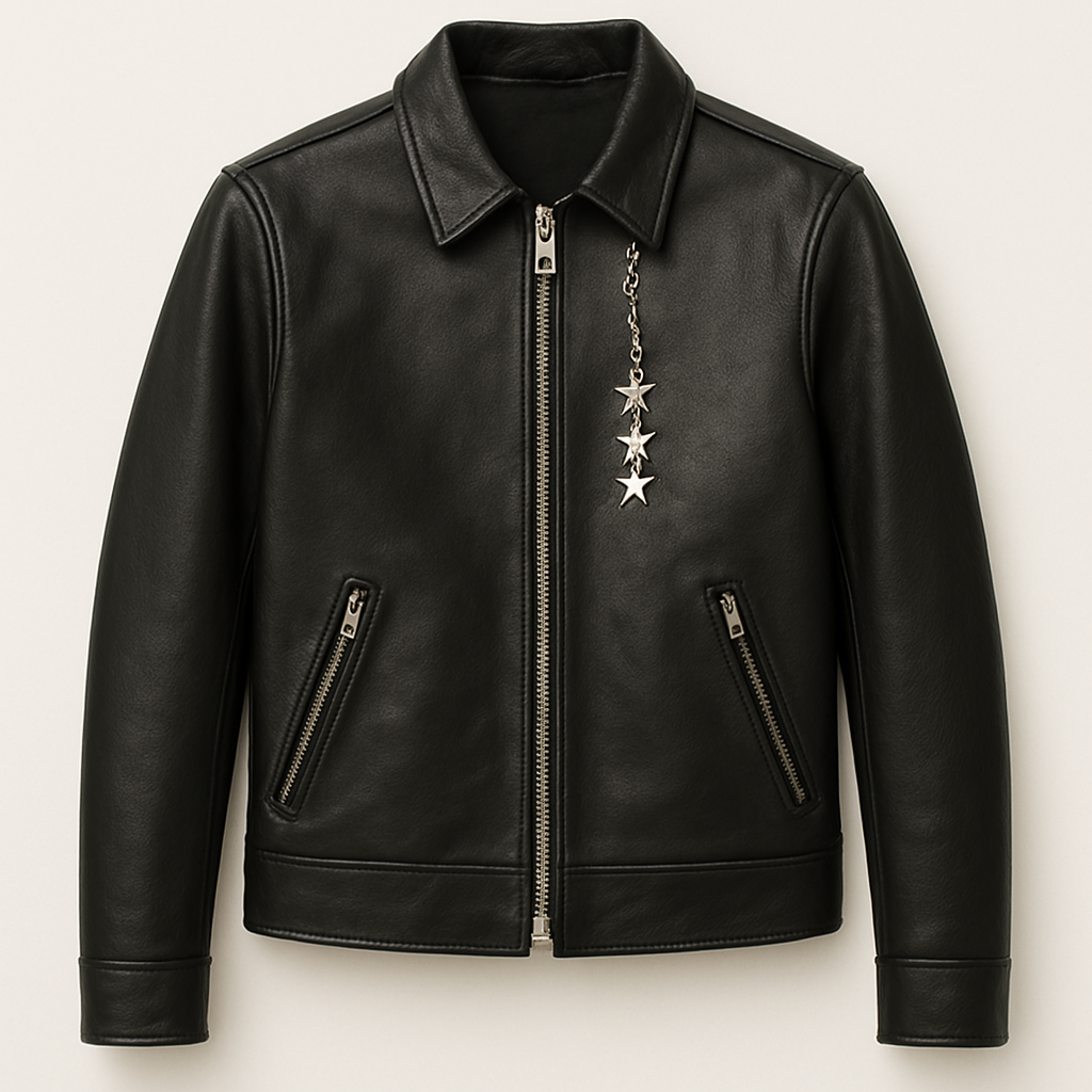 This sleek black leather jacket features a unique silver star charm detail on the zipper, adding an edgy and stylish twist to a classic design. Crafted from 90% premium leather and 10% luxurious metal for the star charm, it offers durability and a sophisticated appearance. The tailored fit and contemporary design give it a bold fashion statement. Perfect for both casual and dressed-up occasions, it brings effortless elegance to your wardrobe.