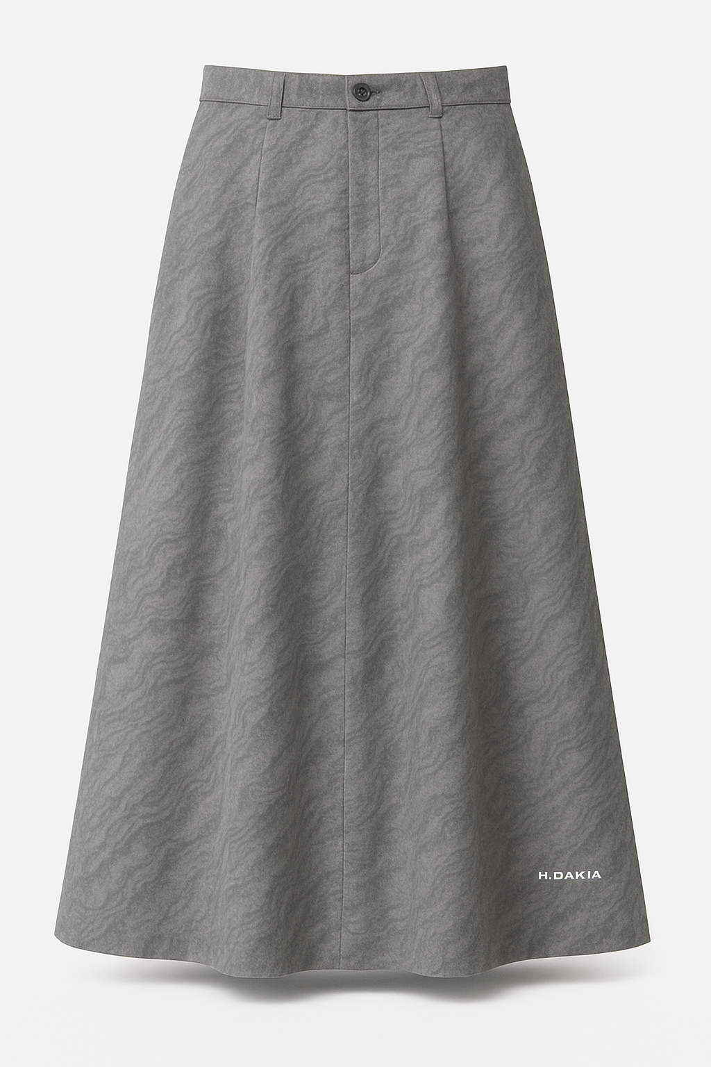 The STONE VEIN A-LINE SKIRT — LONDON EDITION brings fluid elegance to contemporary tailoring. Its graceful silhouette flows from a structured waistband, while the marble wave pattern—reminiscent of natural formations—adds depth and artistry. Timeless yet striking, this skirt is a refined ode to texture and movement, completed with the subtle H.DAKIA signature.