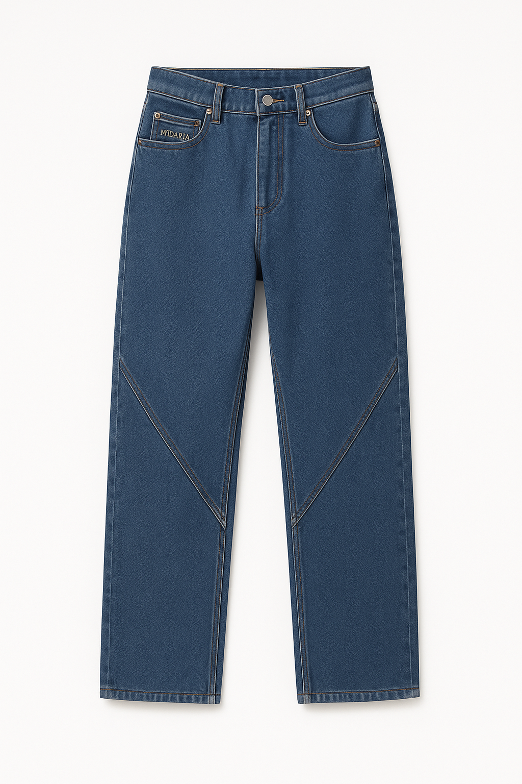 Modern shape meets classic denim in the triangle stitch jeans. Defined by clean triangular panels along the legs, this pair adds a sharp edge to a timeless silhouette. The relaxed fit ensures comfort, while the embroidered H.DAKIA detail on the pocket makes it unmistakably refined.