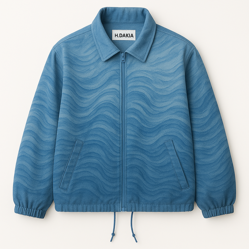This loose-fit windbreaker by H.DAKIA features an artistic watercolour design, with flowing blue waves that create a sense of fluidity and motion. Crafted from 80% polyester and 20% nylon, it offers a perfect blend of durability, flexibility, and comfort. The jacket is made with lightweight, water-resistant fabric, ideal for various weather conditions. It comes with a stand-up collar and a sleek hidden zipper for a clean look, while the adjustable drawstring hem and elasticized cuffs ensure a perfect fit. The large, angled side pockets add functionality to its modern aesthetic. With its unique marbled design and comfortable fit, this windbreaker is ideal for anyone who values both fashion and performance.